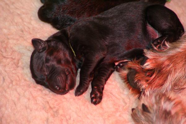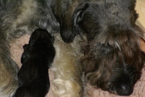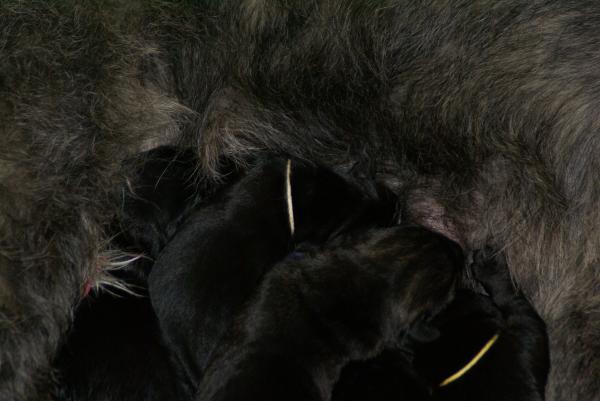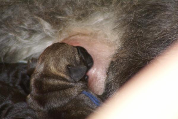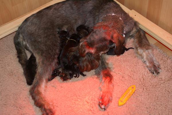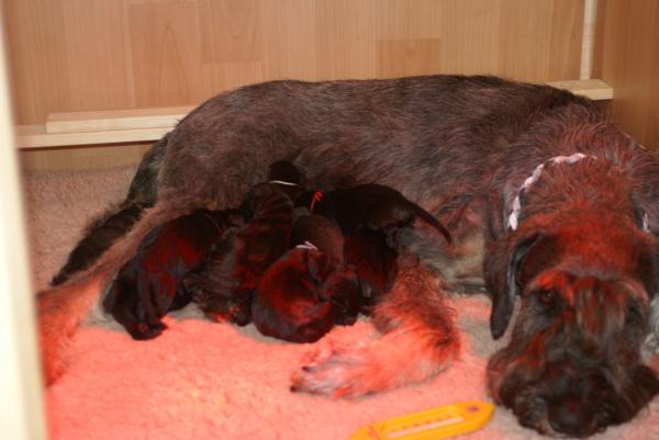 Sie ist ein instinktsichere Hündin und hat alles ganz alleine geschafft. Innerhalb von nicht mal viereinhalb Stunden waren alle geboren, ausgepackt, abgenabelt und sorgfältig trocken geleckt. Auch in der Pflege der Kleinen erweist sie sich als fürsorgliche, aufopferungsvolle Mama. Wir sind sehr glücklich!