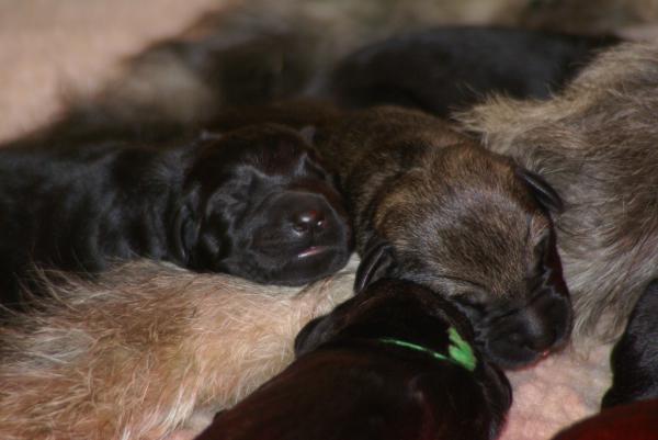 Alle Welpen legen an Gewicht zu. Zuweilen geben sie ein Konzert. Das klingt dann wie 11 rostige Trompeten. Wunderschön! Besonders dann, wenn ein Bruder oder eine Schwester einem eine Zitze streitig machen will, wird heftig protestiert.