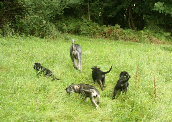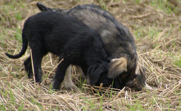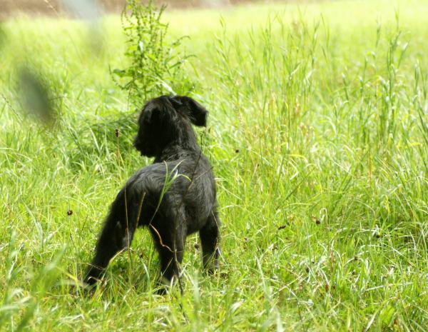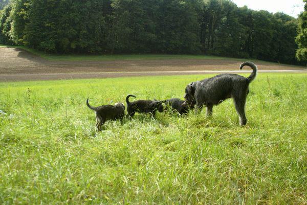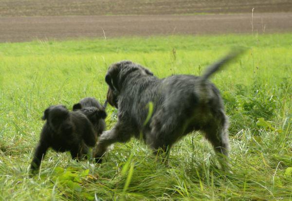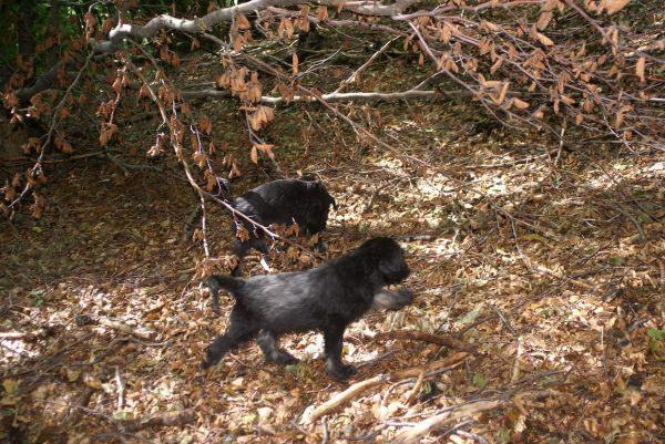 Im Wald machen sie sich dann mit Wonne über alles Neue her: Sie nagen an Stöckchen, rascheln im Laub, buddeln in der Erde, und wie es sich für einen richtigen Riesenschnauzer gehört, sammeln sie auch Kletten im Bart. Einzig der stets elegant schicke Mato hat damit überhaupt keine Probleme. Sein Fell scheint eine Selbstreinigungsfunktion zu besitzen.