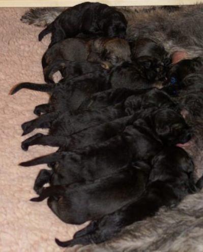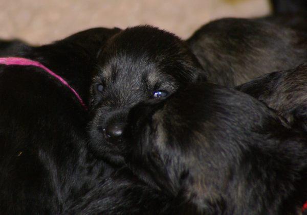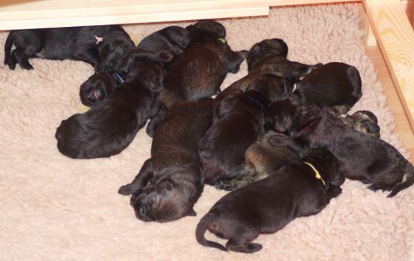 02.07.2007 Die Welpen sind jetzt eine Woche auf der Welt und alle entwickeln sich prächtig. Hündinnen Gelb und Hellblau sowie Rüden Pink haben ihr Gewicht verdoppelt, alle anderen sind nahe dran. Und das bei einem solch großen Wurf! Janne gibt wirklich alles. Sie ist eine vorbildliche Hundemama.