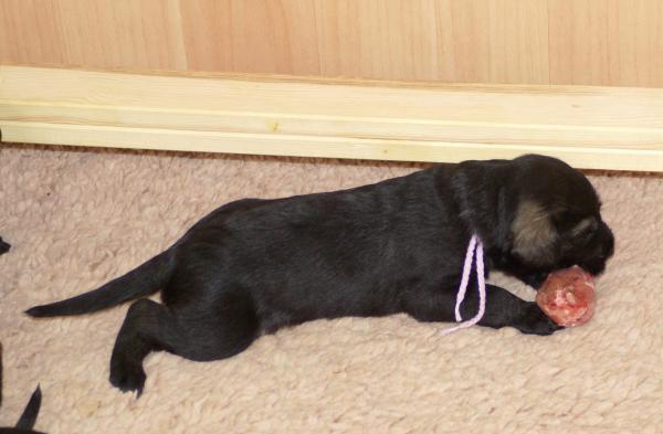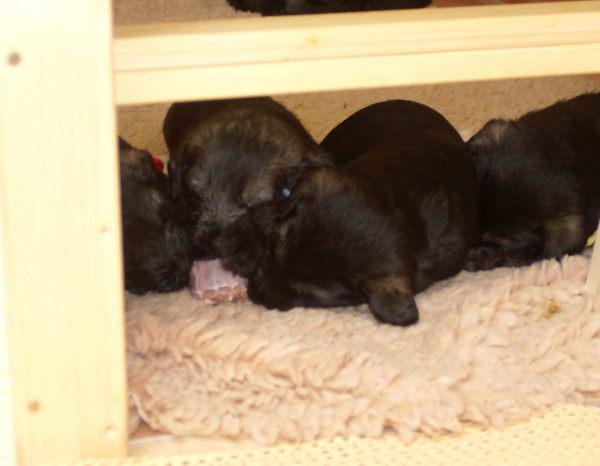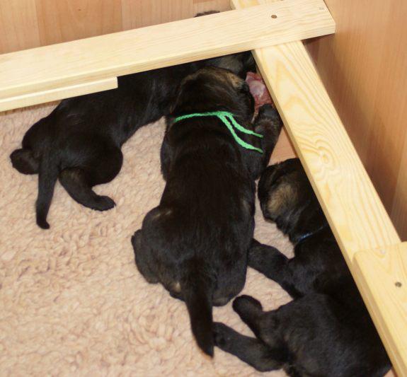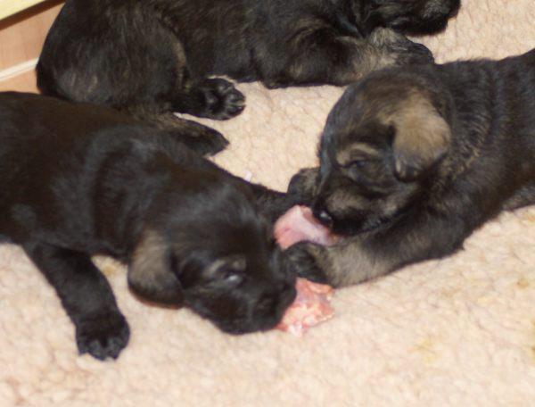 16.07.2007 Heute wird der dritte Wochengeburtstag gefeiert: Es gibt Putenhälse! Das ist ein Schmatzen und Lecken! Wie kleine Wölfe fallen sie darüber her und reißen und zerren daran. Natürlich wird davon noch nichts gefressen, aber der Geschmack wird gekostet und eines zukünftigen Riesenschnauzers für würdig befunden. Und sobald sich alle müde gespielt haben, tut sich Mama daran gütlich.
