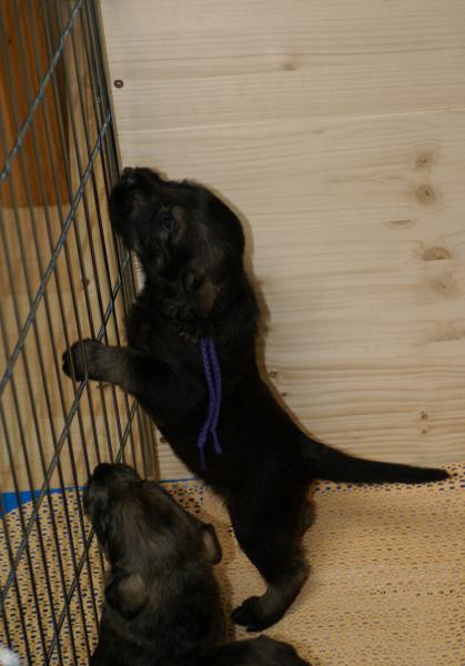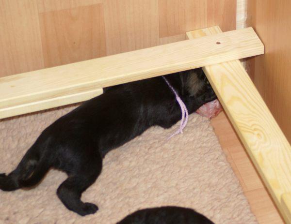 Weitere Charakterstudien: Schwarz läßt sich durch fast nichts aus der Ruhe bringen. Wenn der mal eine Zitze hat, bleibt er dran, bis nichts mehr ins Bäuchlein geht. Auf Herrchens Arm fühlt er sich am wohlsten. Rot liebt es, in extravaganten Positionen zu schlafen (siehe Foto). Dunkelblau hüpft und springt schon recht behende, ist sehr aktiv und verspielt.