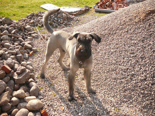 "Wie man sieht, ist unsere Gegend sehr steinig; das ganze Erdreich ist voll davon und jeder Spatenstich in der Nähe unseres Hauses wird zu einer Herausforderung. Oscar selbst trägt gerade eine Schleppleine und hat sich mal wieder festgehakt. Da er bei nachlassender Aufsicht / Aufmerksamkeit die Tendenz zeigt, alleine auf Eroberungstouren gehen zu wollen (und auch schon gegangen ist), muß er an diese Leine."