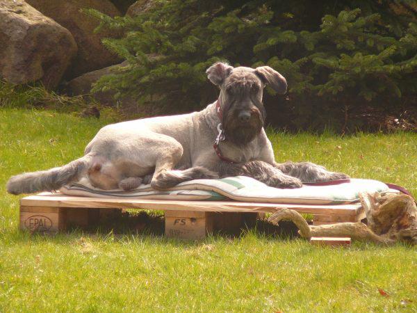 "Nur so auf dem schnöden Rasen zu liegen ist ein wenig unter seiner Würde - er mag es sehr gern leicht erhöht und selbstverständlich weich gebettet! Im Ernst: Im hohen Norden ist es tagsüber noch nicht gar so warm und entsprechend der Boden kalt. Daher haben wir Oscar eine unserer Paletten "geliehen" und ihm noch ein Kissen daraufgelegt - und das mag er. Vor allen Dingen lag in diesem Fall die Palette (also sein Platz !!) so zentral, daß er fast alles im Blick hatte (und das ist gaaanz wichtig !!)"