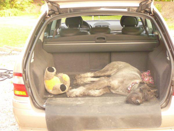 "Oscar liegt nach etlichen Tobereien und Drangsalierereien der Handwerker erschöpft in seiner 'Hundehütte'."