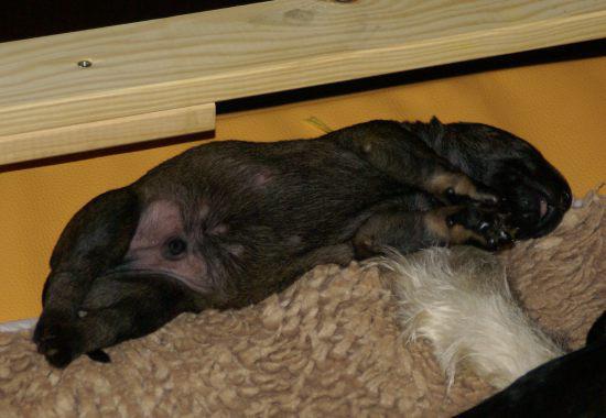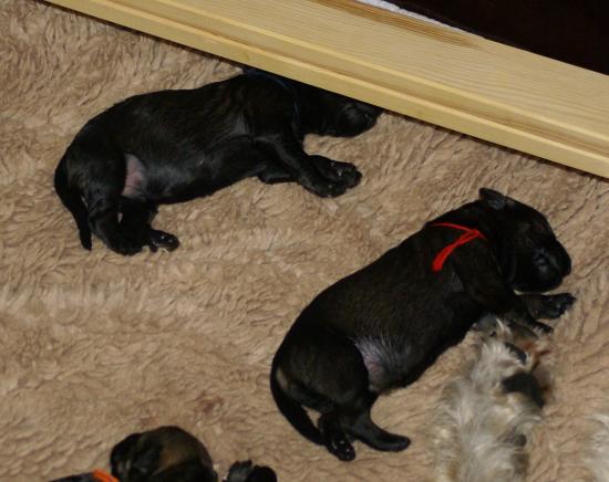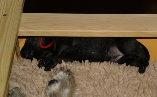 Herr Gelb hat heute die 1000-Gramm-Marke geknackt und somit, genau wie Herr Orange, Frau Grün und Frau Braun innerhalb von fünf Tagen sein Gewicht quasi verdoppelt! Nach den Mahlzeiten halten sie mit Vorliebe unter dem Distanzrahmen ein Verdauungsschläfchen und wundern sich, wenn sie hinterher nur sehr mühevoll darunter weg kommen. Frau Rot ist die erste, die schon fast richtig bellen kann und dieses auch bei jeder Gelegenheit, die ihr nicht paßt, tut.