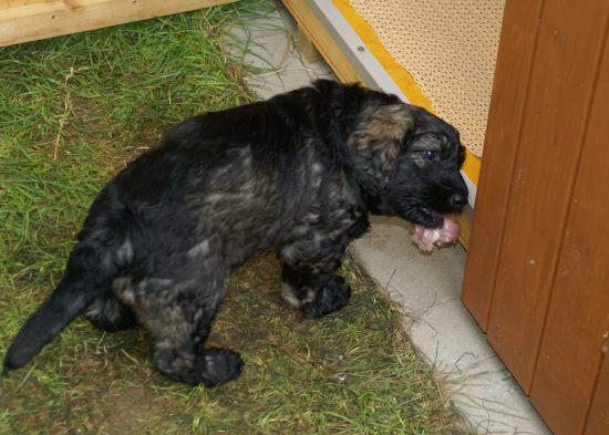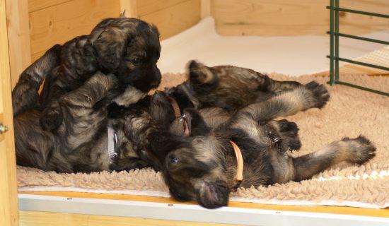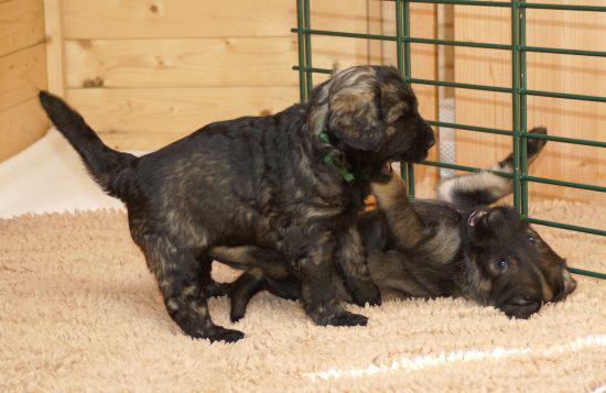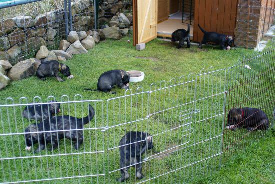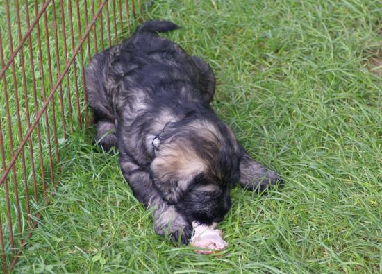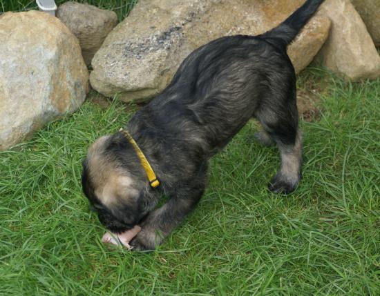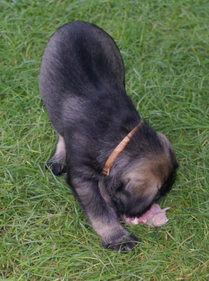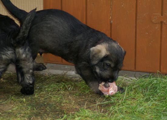 Seit ein paar Tagen bekommen die Kleinen eine Joghurt-Mahlzeit mit täglich einer Zutat mehr: Honig, Apfel, Karotte, Banane. Jeder bekommt sein eigenes Schälchen, denn manche schlabbern sehr gierig, andere zeigen sich eher als der Typ Genießer. Von den Hähnchenschenkeln bleiben mittlerweile nur noch die Knochen übrig. Noch nimmt Frauchen sie weg, aber bald werden auch diese in den Mägen der kleinen Raubtiere verschwinden.