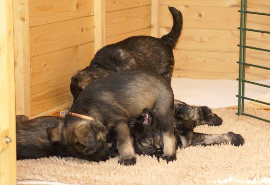 Zur Feier des vierten Wochengeburtstags hat Frauchen ganz frisches Tartar "gejagt". Das war ein Schlecken und Schmatzen! Die kleinen Schnauzen bebten vor Erregung ob dieser Leckerei. Viel zu früh lernten sie den Begriff "fertig" kennen. Aber die Putenhälse am Nachmittag wurden auch nicht verachtet. Und dann gibt es auch immer wieder eine Zwischenmahlzeit an Mamis Milchbar.