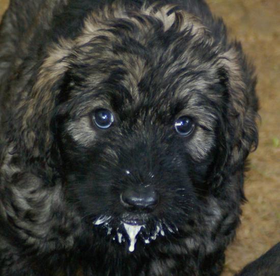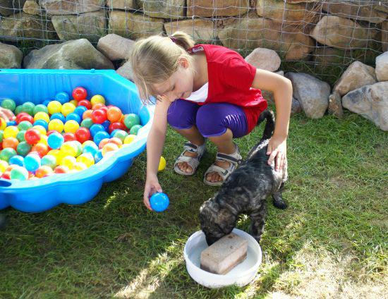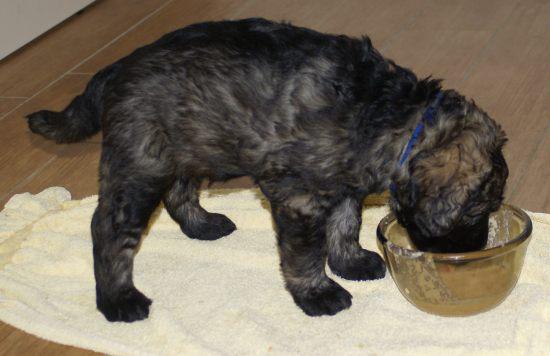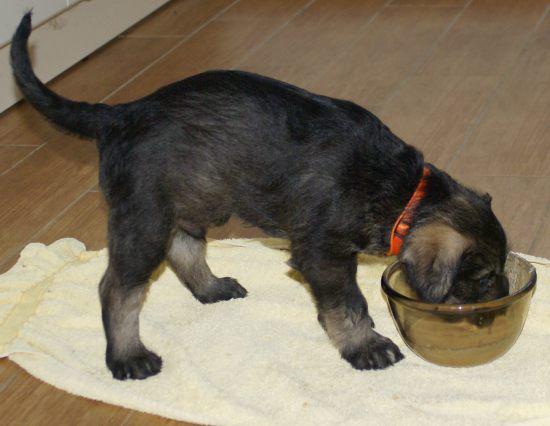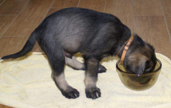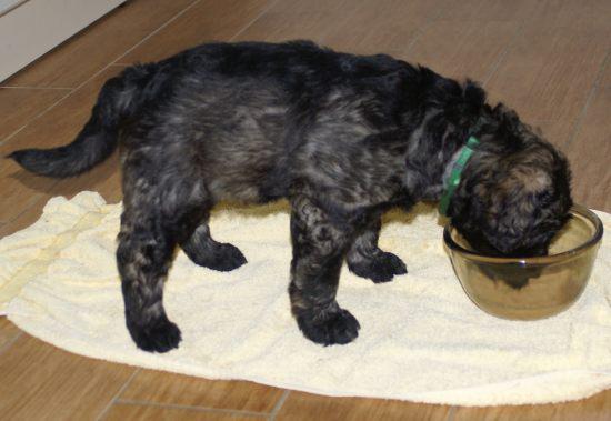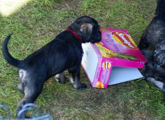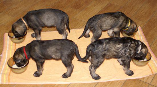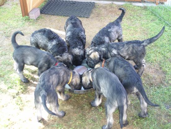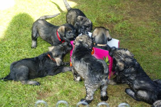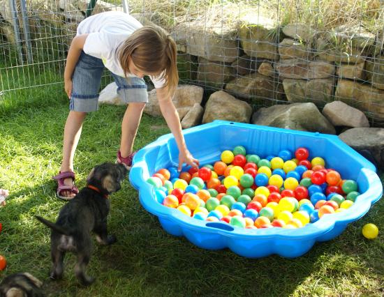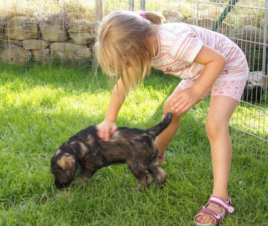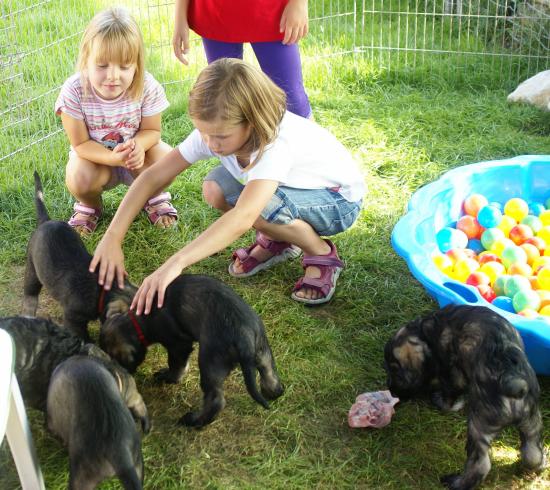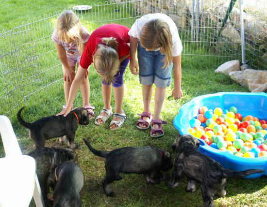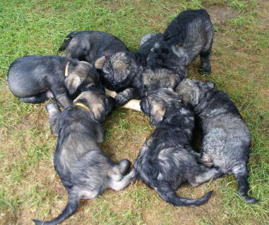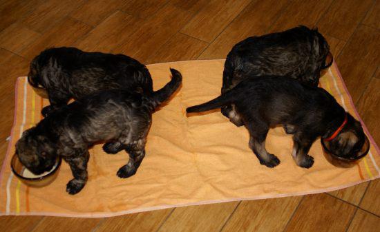 Heute war wieder ein aufregender Tag: Wir hatten Besuch von Julia, Karla und Lena. Die Mädchen gingen sehr liebevoll mit den kleinen Hunden um, und diese wiederum zeigten ihnen, wie fünf Wochen alte Riesenschnauzer Hähnchenschenkel bis auf den Knochen abnagen.