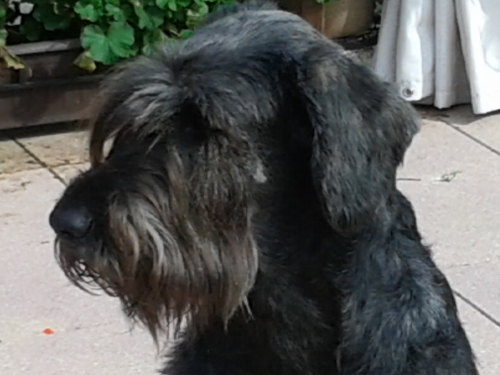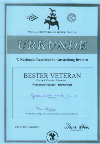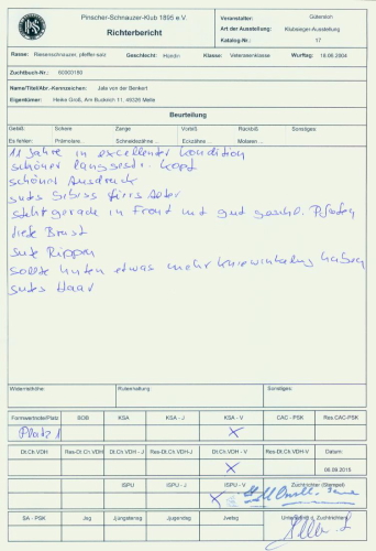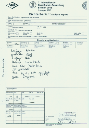 Frauchen ist ein wahrer Ausstellungsmuffel, aber heute haben wir uns seit langem mal wieder aufgemacht zu einer KSA unserer Ortsgruppe. Die Richterin äußerte sich sehr bewegt darüber, daß sie mit Janne einen solch schönen, aufgeweckten elfjährigen Riesenschnauzer "in exzellenter Kondition“ kennenlernen und richten durfte. Nicht erst seit heute wissen wir die große Gnade, daß Janne bei uns ist, jeden Tag zu schätzen.
