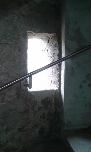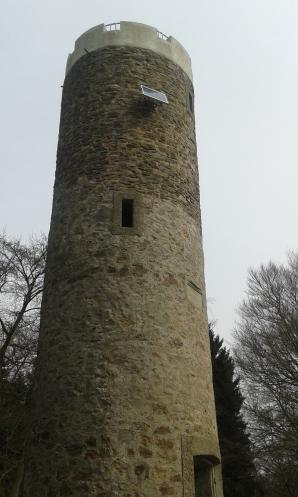 Es trug sich bereits am 17. August 2014 zu, als wir mit unserer Freundin Tilly eine Wanderung zum Nonnenstein unternahmen und Ais' zweiten Geburtstag feierten. Unsere beiden neugierigen Mädchen liefen schon mal vor und erstiegen den Turm von innen. Um dieses eigenmächtige Handeln zu unterbinden, rief ich sie. Janne kam. Ais nicht. Ich lief zum Eingang des Turmes und hörte sie drinnen fiepen. Ich stürzte die Stufen hinauf und sah sie in einer Schießscharte stehen, vor sich ein tödlicher Abgrund, hinter sich der Handlauf, die Scharte zu schmal um sich umzudrehen. Sie hatte, meinen Ruf hörend, den direkten Weg zu mir wählen wollen, war auf das Fenstersims gesprungen und sah sich diesem furchtbaren Abgrund gegenüber. Ich flog gewissermaßen die letzten Stufen hinauf zu ihr, packte sie am Geschirr und hob sie – in einer solchen Situation erwachsen einem Bärenkräfte! – zu mir herunter. Ich glaube, es war das erste Mal, daß ich heilfroh war, daß sie meinem Ruf nicht bedingungslos gefolgt war! Heute waren wir mal wieder dort und holten nach, zu woran wir damals verständlicherweise keinen Gedanken hatten: Fotos zu machen.