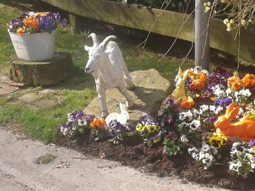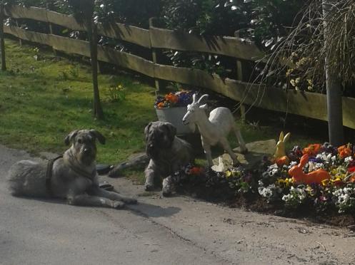 Heute haben wir auf unserem Morgenspaziergang eine weiße Ziege und bunte Osterhasen getroffen. Frauchen war diese Idylle ein Foto wert.