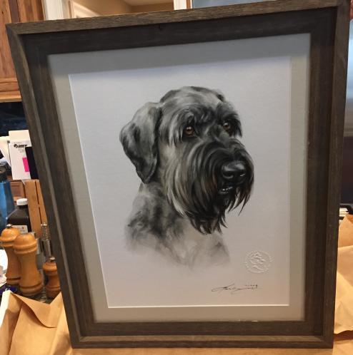 Nachdem das Portrait von Obi, gemalt von der großartigen Künstlerin Gabriele Laubinger, endlich den Weg über den großen Teich gefunden hat, hat Herrchen es auch sogleich rahmen lassen und sofort nach dem Auspacken begeistert ein Foto geschickt.