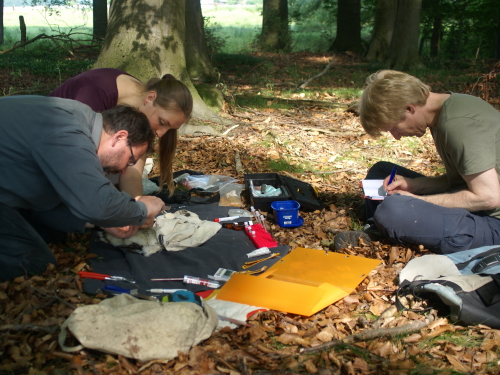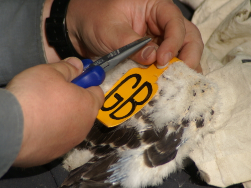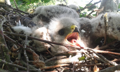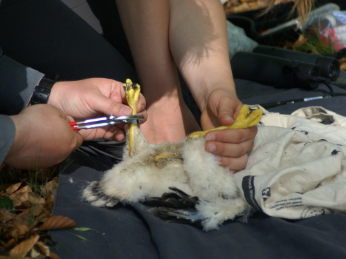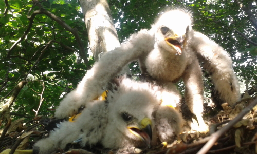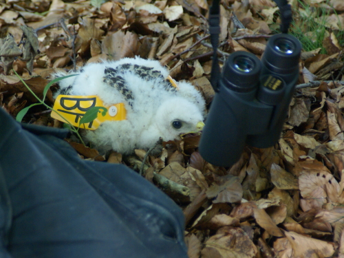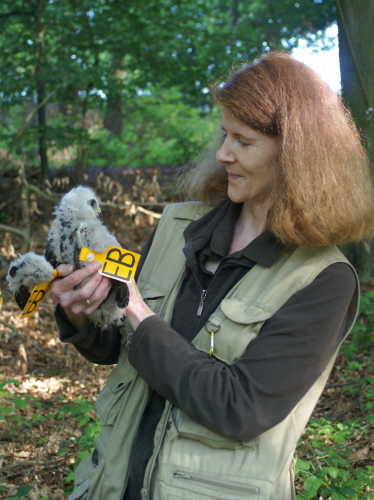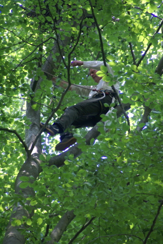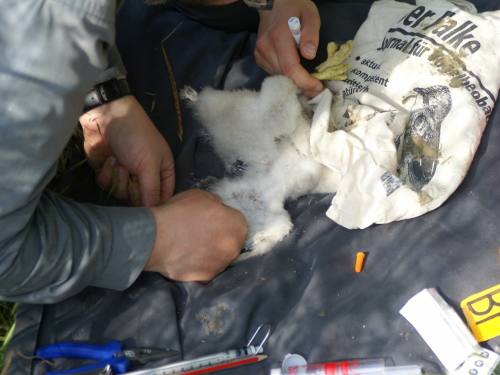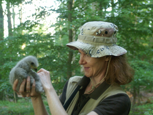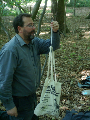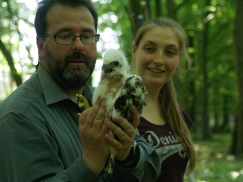Frauchen durfte einen ganzen Tag lang Prof. Dr. Krüger von der Universität Bielefeld und sein Team begleiten und an deren Beringungssaktion von Bussarden teilnehmen. Während unsere Mädels mit Herrchen den Teuto unsicher machten, konnte sich Frauchen ganz ihrer zweiten tierischen Leidenschaft – Vögel und insbesondere Greifvögel – hingeben und einen langgehegten Wunsch erfüllen: Einmal nicht nur via Webcam auf www.looduskalender.ee, sondern ganz real beobachten, wie Bussarde beringt werden. Mit einer riesengroßen „Steinschleuder“ wurde ein Gewicht an einer leichten Schnur über einen Ast hoch im Baum geschossen, um damit das Steigseil hinaufzuziehen. Daran kletterte ein befugter Spezialist zum Nest hinauf und ließ an einer Schnur die Küken in einem Stoffbeutel zu Boden. Dort wurden sie vermessen, gewogen und auf ihre Persönlichkeit getestet. Sie wurden beringt und mit gut ablesbaren Flügelmarken versehen, auf daß sie möglichst zahlreich gesichtet und von der Bevölkerung gemeldet werden. (Diesbezügliche E-Mails an Oliver.Krueger@uni-bielefeld.de sind willkommen!) Ihnen wurde für genetische Tests und Gesundheitsprofile Blut und Geruchsproben von der Bürzeldrüse abgenommen. Es wurde die Atemfrequenz und der Befall mit Ektoparasiten gezählt und dergleichen mehr. Alles wurde gewissenhaft in ein Büchlein eingetragen. Wertvolle Daten für die Forschung. Unter den Rufen der Elterntiere ging es dann wieder aufwärts ins heimische Nest, von dem auch gleich die Art und Anzahl der dort liegenden Beute und von den Eltern eingebrachten frischen Zweige (gegen Parasiten?) dokumentiert wurde. Am Rande gab es interessante Begegnungen mit Menschen. Da war z.B. der aufgebrachte Geflügelzüchter, der auf die Bussarde gar nicht gut zu sprechen war, am liebsten alle Bäume fällen würde, so daß die Vögel keine Nester mehr bauen können, und über die Rückkehr des Wolfes nach Deutschland schimpfte, der seiner Meinung nach in absehbarer Zeit das erste Kind anfallen und töten würde, der jedoch auch zugeben mußte, daß andere Prädatoren – er hatte eine Fuchsfalle aufgestellt – auch ihren Teil zu seinen Verlusten betragen. Da war aber auch der Junge, welcher in Begleitung seines Vaters spontan der Beringung beiwohnen dufte. Wie behutsam und mit wieviel Respekt er zum ersten Mal ein Bussardjunges in seine Hände nahm! Einfach schön. Was für ein erlebnisreicher, unvergeßlicher Tag! Allen Verantwortlichen große Hochachtung für ihre körperliche sowie mentale Leistung! Und ganz herzlichen Dank an das gesamte Team, Ihr seid großartig!
