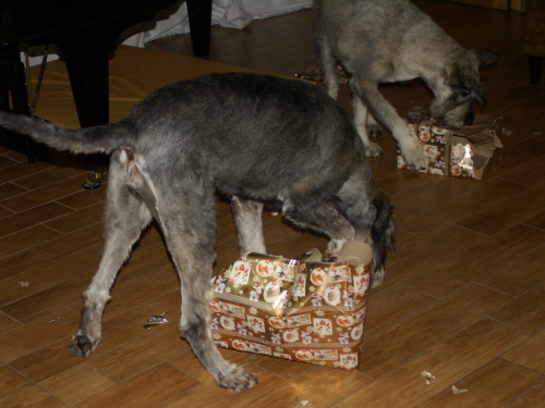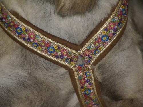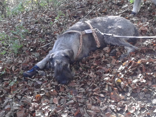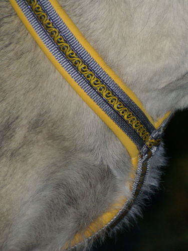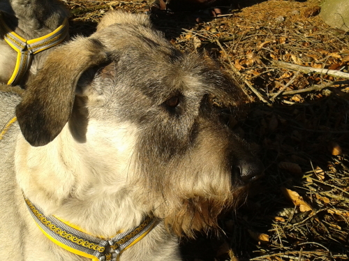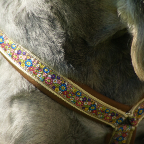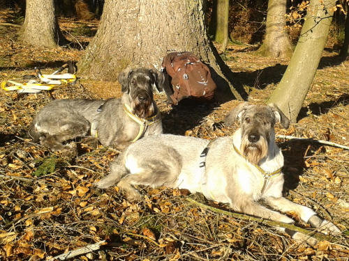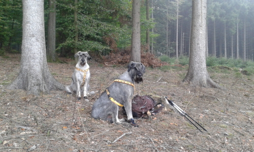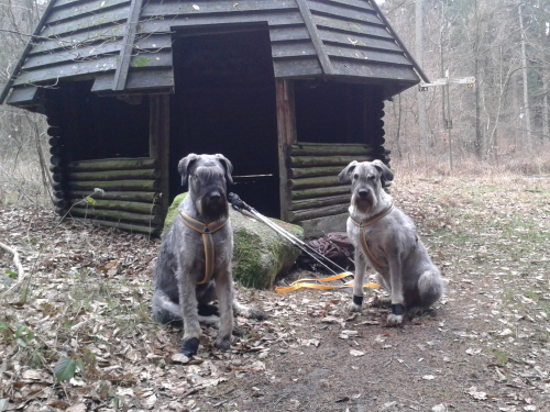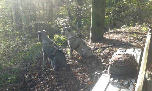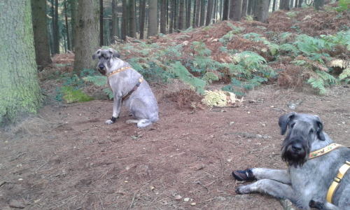 Heute könnten die neuen Geschirre ausgeführt werden, aber nach dem Fototermin werden sie schnell wieder ausgezogen. Frauchen will es so. Bei diesem Schmuddelwetter stapfen wir lieber nicht so schick durch den matschigen Wald...