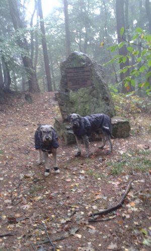 Danach geht es bergab und vor allem steil bergauf – da bekommt der Name Wiehengebirge“ schon eine sprechende Bedeutung – hinauf zur Babilonie, einer ziemlich unspektakulären germanischen Wallanlage, von der allenfalls der Name und dessen überraschende Bedeutung interessant zu sein scheint. Inzwischen hat sich der Nebel zu einem gemütlichen Herbstregen entwickelt, aber Frauchen hat vorgesorgt und aus ihrem wunderbaren Rucksack schützende Regenmäntel gezaubert...