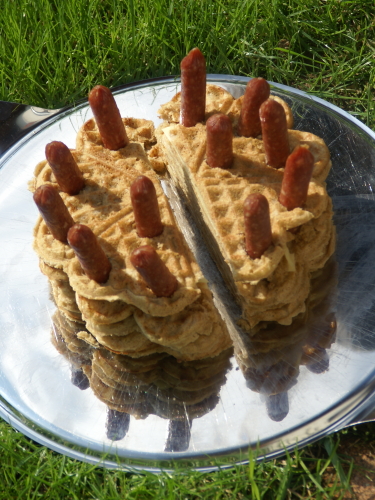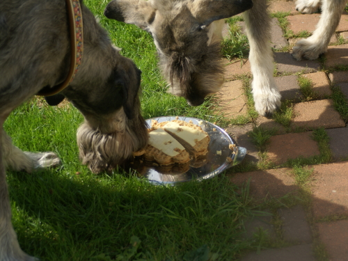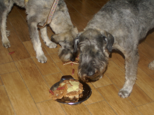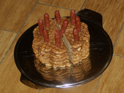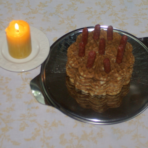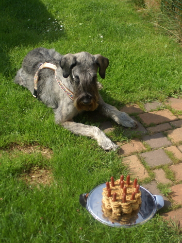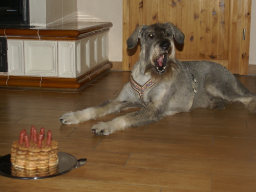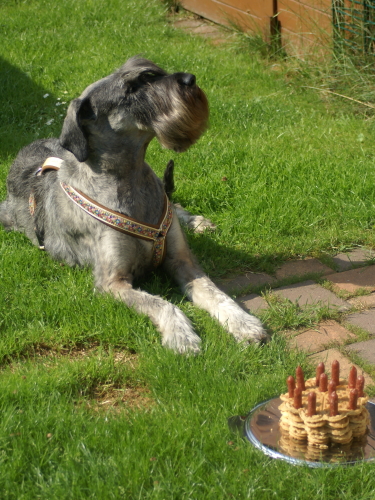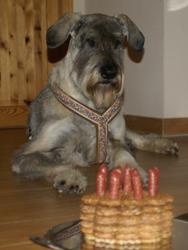 Kaum zu glauben: Unser Wirbelwind, "das“ Ais, feiert heute neunten Geburtstag! Herzlichen Glückwunsch, meine Sonnenblume, mein Gute-Laune-Seelenhund! Wie letzte Woche versprochen, gab es auch heute eine Käsetorte aus Buchweizenmehl, Eiern und Ziegenmilch, als Zwischenschicht Käsescheiben und als Krönung Salamikerzen.