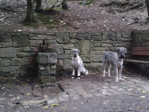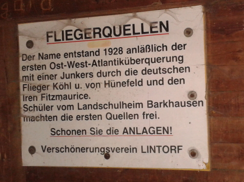 Gefunden! Dank der virtuellen Wanderkarte mit eingezeichneter Route von unserer "Tante Sabrina“, konnten wir heute ganz einfach zu jener berühmten Quelle pilgern und dort endlich das berühmte klare Wasser schöpfen. Es handelt sich hier um eine von mehreren Quellen des Westerbachs am Westhang des Wurzelbrinks im Wiehengebirge. Ganz wie in diesem Artikel beschrieben, trafen wir tatsächlich eine ältere Dame, die sich vier große Flaschen Wasser abfüllte, um damit zu Hause Tee zu kochen. Wir hielten einen netten Plausch, und währenddessen kam ein Hund mit seinem Herrchen extra herauf spaziert, um Wasser zu schlabbern und dann wieder umzukehren u.s.w. Ein sehr fröhlich kommunikativer Ort. Nur die Begegnung mit Wildschweinen ist uns glücklicherweise erspart geblieben. So etwas würde aller Erfahrung nach für Hunde nicht gut ausgehen. Anschließend haben wir von da aus nach kurzem Zögern noch den steilen Aufstieg zu "unserem“ neu entdeckten Türmchen absolviert, und sind voller Zufriedenheit zu unserem Auto zurück gewandert.