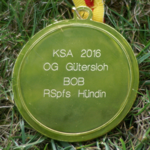Unsere PSK Ortsgruppe hatte zur Ausstellung geladen. Wir sind der Ansicht, daß unsere Janne mit ihren 12 Jahren unbedingt gezeigt werden muß, ist sie doch ein tolles Zeugnis dafür, daß Riesenschnauzer wunderbar alt werden und dabei richtig fit und schön bleiben können. Dieser Meinung war der Richter auch, und so gab es den ersten Platz in der Veteranenklasse und eine Medaille als schönste Riesenschnauzer-pfeffer-salz Hündin.