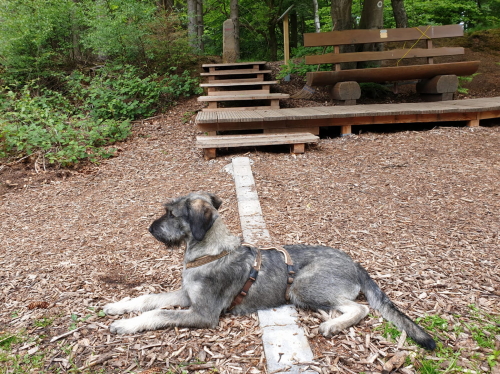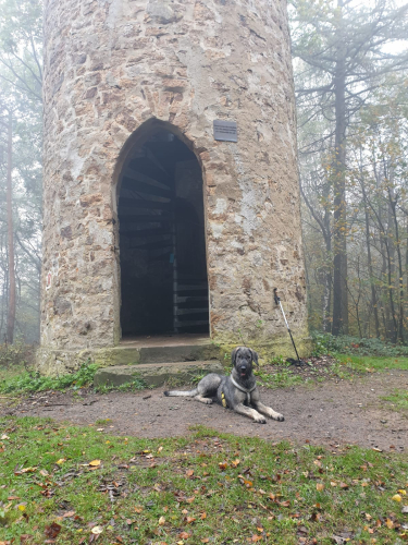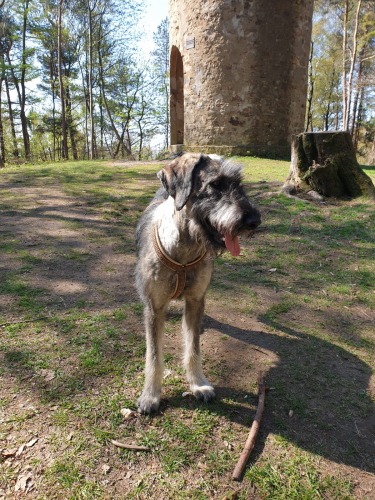 Wanderung zu "unserer“ Quelle am Wurzelbrink. Derzeit sprudelt sie recht kräftig. Laani verschmäht natürlich das Wasser, welches Frauchen – ganz wie es sich für ein braves Frauchen gehört – im Rucksack mit schleppt, und schlabbert viel lieber direkt aus der Quelle. Ausnahmsweise darf sie das, denn ansonsten sind Pfützen und stehende Gewässer tabu. (So lautet zumindest der Plan...) Also Flasche geleert, und ruckzuck aufgefüllt mit dem außergewöhnlich leckeren Quellwasser für zu Hause. Dann der Aufstieg zum Wartturm... Laani war "Erster“!