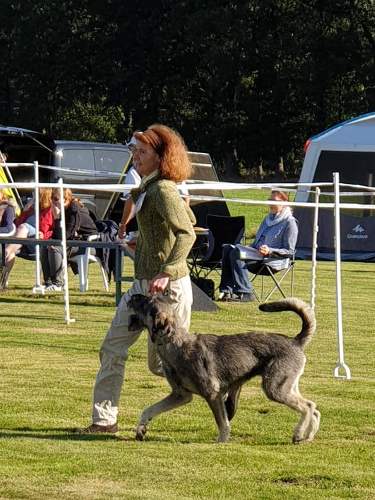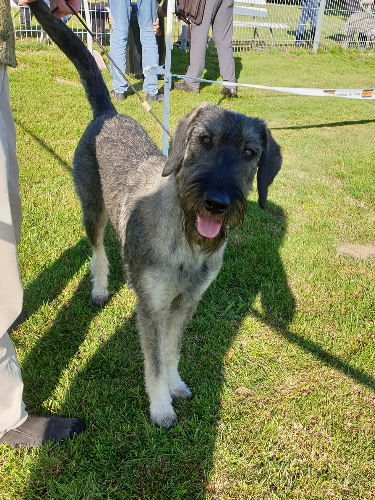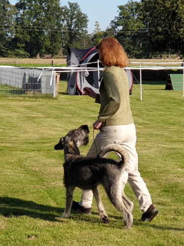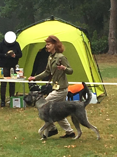 Gesagt, getan. Heute besuchten wir also die KSA in Osnabrück. Laani benahm sich großartig! So kann es bleiben. Plansoll erfüllt. Aber der dortige Richter, Herr Lohmann, ließ kein gutes Haar an ihr. Zwar lobte er ihr freundliches Wesen, aber sie war ihm zu schmächtig, hatte zu wenig Bart und, weil Frauchen noch immer nicht wieder schnell genug rennen kann, lief sie – nicht immer, aber überwiegend – im Paßgang. Infolgedessen wurde eine zu steile Hinterhand bemängelt. Wir kassierten also ein schnödes "G" (gut). Wir haken es als "gute“ Übung ab.