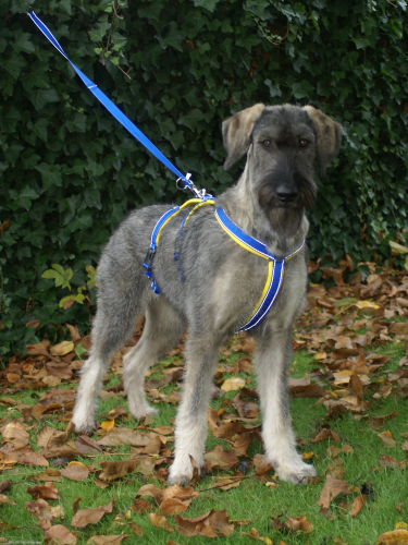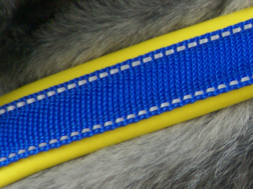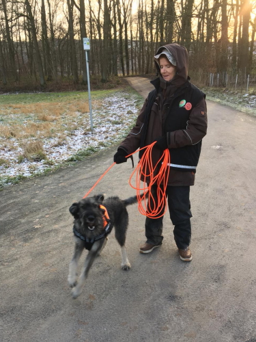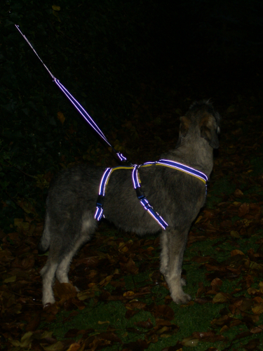 Laani, wie ein Streifenwagen auf vier Pfoten! Kein Geburtstag, kein Weihnachten steht im Kalender, aber die dunkle Jahreszeit hat erforderlich gemacht, daß Laani außerplanmäßig ein neues, reflektierendes Geschirr bekommt. Die Autofahrer bremsen deutlich ab und fahren merklich langsamer an uns vorbei, wenn wir damit in der Dunkelheit unterwegs sind, zumal dann auch noch zwei helle LED Lämpchen daran befestigt sind.