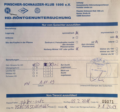 Was lange währt... Nach vielen Irrungen und Wirrungen ist das HD-Ergebnis der Röntgenaufnahme vom 7. August endlich eingetroffen! Beinahe wäre es ein A1 geworden, wie bei Urgroßmutter Ais, aber unsere Gutachterin, Frau Viefhues, war am 1. November nicht in Feiertagslaune und hat das bereits Angekreuzte noch mal abgeändert. Egal, wir freuen uns auch riesig über das A2 (wie bei Ur-Ur-Großmutter Janne).