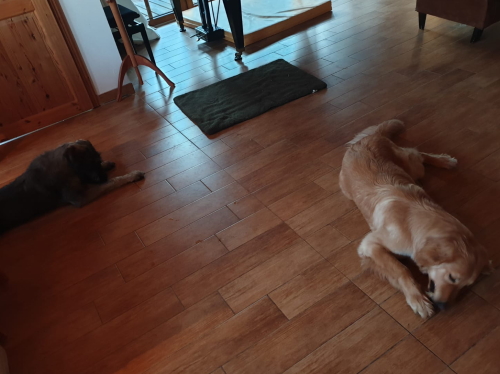 „Morgenstimmung 06.30 Uhr. Hundchen munter, Frauchen müde .“