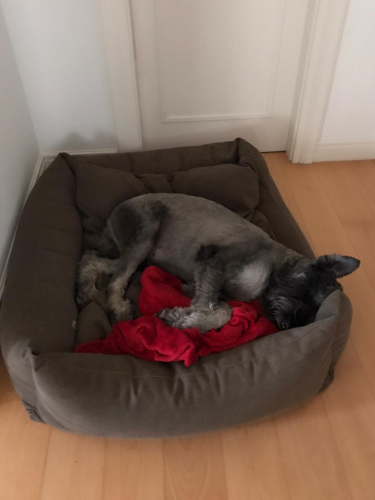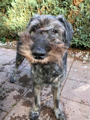 Es war ein ausgesprochen schönes Telefonat mit Arcos jungem, tollem Herrchen, trotz des traurigen Inhalts: Arco ist bereits am 4. April 2019 über die Regenbogenbrücke gelaufen. Anschließend schreibt er: „… Aber wie schon beschrieben, war es ein kurzer Kampf und an sich sehr leidfrei. Er hatte zwar im höheren Alter eine etwas schwächere Blase und musste manchmal spät abends raus, aber ansonsten war er sehr fit und lebensfroh. Die Zeit zu Hause hatte er immer gerne im Garten oder auf seinem Podest verbracht. Von dem Podest aus konnte er immer die Tür betrachten und auch in der Sonne schlafen. Im Garten musste man ihn schon animieren, den Ball oder Stock zu holen, aber die Nachbarskatze war bis zu den letzten Tagen seine größte Hassliebe. Die zwei haben immer aufeinander gewartet, um sich um das Revier zu streiten. Und wenn keiner kam, ging man zum nächsten Zaun in der Hoffnung, dass die alte Nachbarsdame vielleicht etwas Leberwurst oder einen Keks hat. Dann war er wie ein Zirkuslöwe und befolgte jedes Kommando mit höchster Konzentration und Geduld. Es gab ja auch was Leckeres. Im Haus gab es immer, egal in welchem Haushalt er später war, nur zwei Sachen, die sein Gemüt beruhigten: Eine Decke, die er mitnehmen und präsentieren konnte, notfalls auch ein Kissen. Und natürlich ein Tisch oder eine höhere Bank unter die man sich legen kann. Auch wenn zu viele Füße unter dem Tisch waren, der Platz mit dem Dach über dem Kopf war seiner. Und von dort aus konnte man auch jedes Herrchen und Frauchen beobachten und hoffen, dass was runterfällt. Wenn man ihn alleine ließ, wusste er ganz genau, dass er nicht auf das Sofa darf, aber von dort aus kann man immer so gut die Straße beobachten. Und so geschah es dann, dass wir ihn bei seiner Routinekontrolle der Straße mal nach dem Einkaufen erwischt haben. Mit den Vorderpfoten auf der Rückenlehne und seinem dunklen Kopf fast an die Scheibe gepresst, schaute er uns verwundert an, wieso wir denn schon wieder zurück sind. Als Entschuldigung brachte er uns zur Begrüßung dann meistens seine liebste Decke. Und wenn er mal nichts finden konnte um jemanden, den er sehr mochte, zu begrüßen, suchte er panisch im ganzen Haus. In der Panik schnappte er sich auch manchmal die guten Sofakissen. Aber ohne Begrüßungskissen/-decke jemanden zu empfangen wäre für ihn eine Katastrophe gewesen. Bis ins hohe Alter hat er sich kaum verändert. Die langen Spaziergänge waren das Wichtigste für ihn, und wenn er kuscheln wollte oder raus musste, dann war das für alle Anwesenden auch so zu machen. Wenn ich neben ihm saß und seinen Brustkorb kraulte und für sein Empfinden zu früh aufgehört habe, hob er seine Pfote und legte sie auf dem Arm ab und signalisierte somit, dass man ihn doch bitte weiter kraulen soll. Wenn man sich dazu entschloss, ihn zu ignorieren, schaute er einen mit Kulleraugen an. Und im äußersten Notfall mauzelte er dann ein, zwei mal um dann wirklich wieder die Aufmerksamkeit auf sich zu ziehen. Er war in jungen Jahren zwar sehr stürmisch, aber zum Schluss wurde auch er ruhiger. Er blieb aber ein Sturkopf. Arco war meiner Meinung nach immer ein zufriedener Hund, der sich in jeder Lebenslage zurecht fand und immer auf jeden gefreut hat. Er liegt jetzt bei mir in der Heimat im großen Garten neben seinem Großonkel Brisko. (Gebürtig Bodo von Elberfeld).“