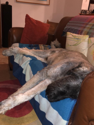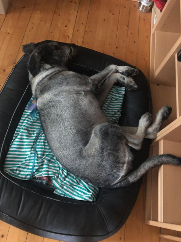 Obi räkelt sich wohlig und zufrieden nach einem langen, harten Tag mit Herumtoben. Bei Herrchen auf dem Sofa schläft es sich dann so richtig entspannt.