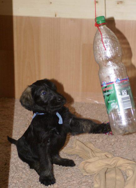 Obi mit einem Stück Stoff aus seiner ehemaligen Welpenkiste