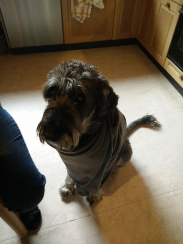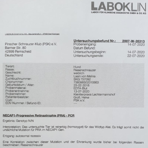 Laani hat Blut abgegeben für einen Gentest, mit dem die erbliche Augenkrankheit Progressive Retinaathrophie (PRA5) nachgewiesen werden kann, die im Alter von ca. 4 Jahren zur Erblindung führt. https://de.wikipedia.org/wiki/Progressive_Retinaatrophie Ergebnis: Laani ist frei davon, und sie ist noch nicht mal Trägerin dieser Genmutation, kann diese Krankheit also nicht weitervererben. Dabei ist das durchaus ein Thema bei den Riesenschnauzern, erst recht bei den „Pfeffiriesen“ mit ihrer „überschaubaren“ Zuchtbasis. Eine befreundete Züchterin hatte vor geraumer Zeit unwissentlich zwei Hunde, welche diese Genmutation tragen, miteinander verpaart, und die Katastrophe nahm ihren Lauf… Sie stellte der Forschung Genmaterial ihrer Hunde und deren Kinder zur Verfügung, daß dieser Gentest entwickelt werden konnte. Hut ab vor dieser Frau! Stammbaumforschung ließ mich aufhorchen und schleunigst diesen, seit Kurzem auch in Deutschland verfügbaren Test durchführen. Freiwillig und auf eigene Kosten, versteht sich. Es wäre schön, wenn unser Zuchtverband bald nachziehen würde und Züchter vor dem ersten Zuchteinsatz eines Hundes zu diesem Test verpflichtet. Gleiches gilt nach wie vor für DCM.